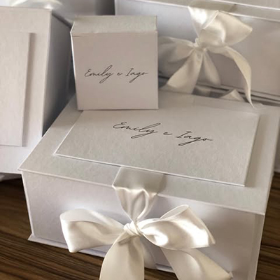 Caixa branca com laço de cetim branco.